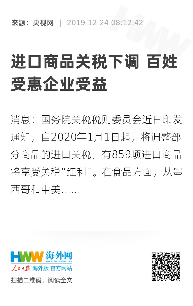 央视网消息:国务院关税税则委员会近日印发通知,自2020年1月1日起,将调整部分商品的进口关税,有859项进口商品将享受关税“红利”。