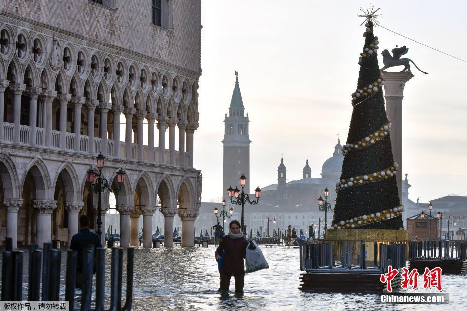 当地时间12月23日,一名女性在威尼斯圣马可广场涉水前行。据报道,意大利水城威尼斯市政府发布消息称,该市23日的新洪峰将达到150厘米,警戒线水位为130厘米。据悉,威尼斯继续遭受自11月开始的严重洪灾。