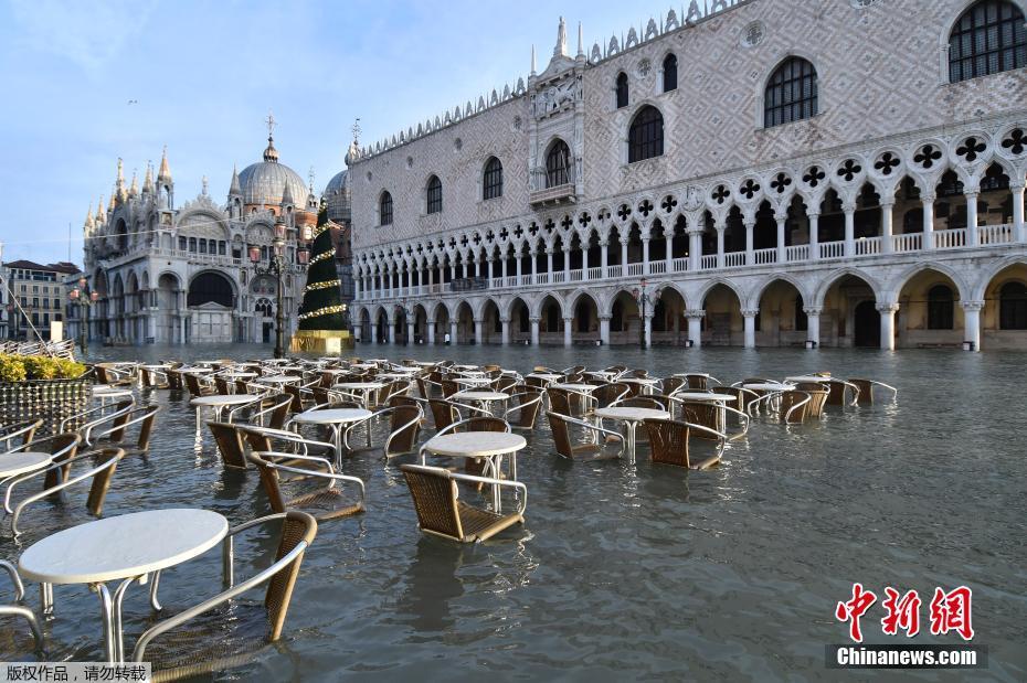 当地时间12月23日,威尼斯圣马可广场咖啡馆的桌椅泡在水中。据报道,意大利水城威尼斯市政府发布消息称,该市23日的新洪峰将达到150厘米,警戒线水位为130厘米。据悉,威尼斯继续遭受自11月开始的严重洪灾。