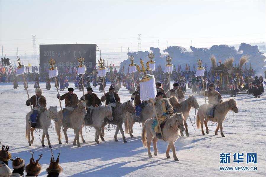 12月23日拍摄的呼伦贝尔冬季那达慕开幕式表演。当日,2019呼伦贝尔冬季那达慕在内蒙古呼伦贝尔市陈巴尔虎旗的那达慕会场开幕,为游客献上一场冰雪上的“视觉盛宴”。新华社记者 徐钦 摄