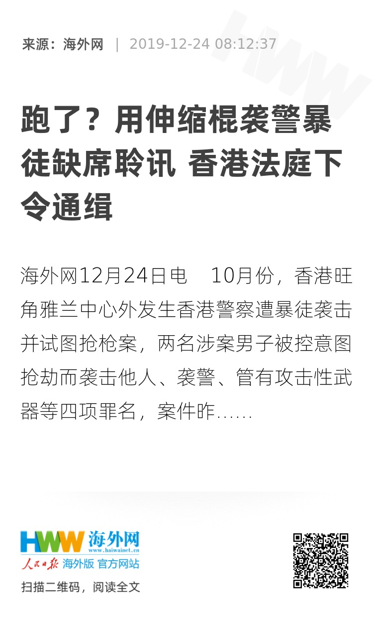 海外网12月24日电 10月份,香港旺角雅兰中心外发生香港警察遭暴徒袭击并试图抢枪案,两名涉案男子被控意图抢劫而袭击他人、袭警、管有攻击性武器等四项罪名,案件昨日(23日)在香港九龙城法院再讯时,其中一名涉嫌参与袭警、任职土木工程师的被告缺席聆讯,被香港法庭下令通缉。