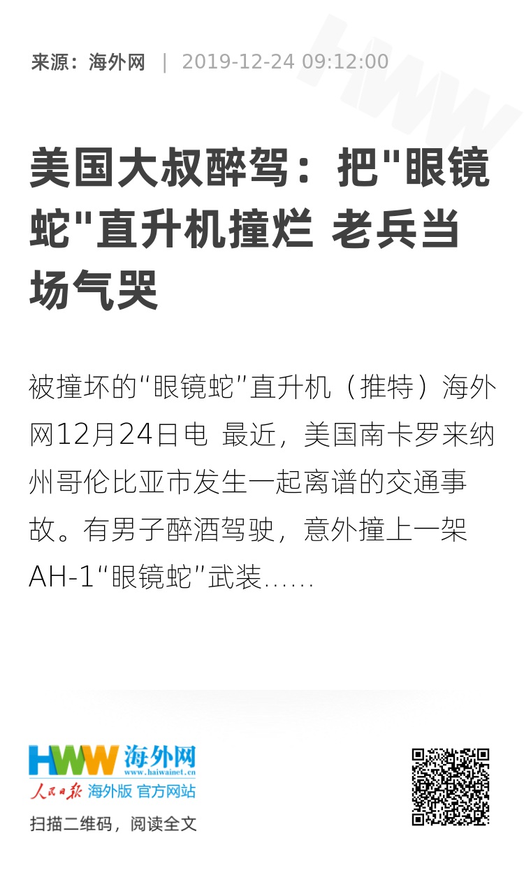 海外网12月24日电 最近,美国南卡罗来纳州哥伦比亚市发生一起离谱的交通事故。有男子醉酒驾驶,意外撞上一架AH-1“眼镜蛇”武装直升机,并致其严重受损。男子肇事后逃逸,最终被捕。