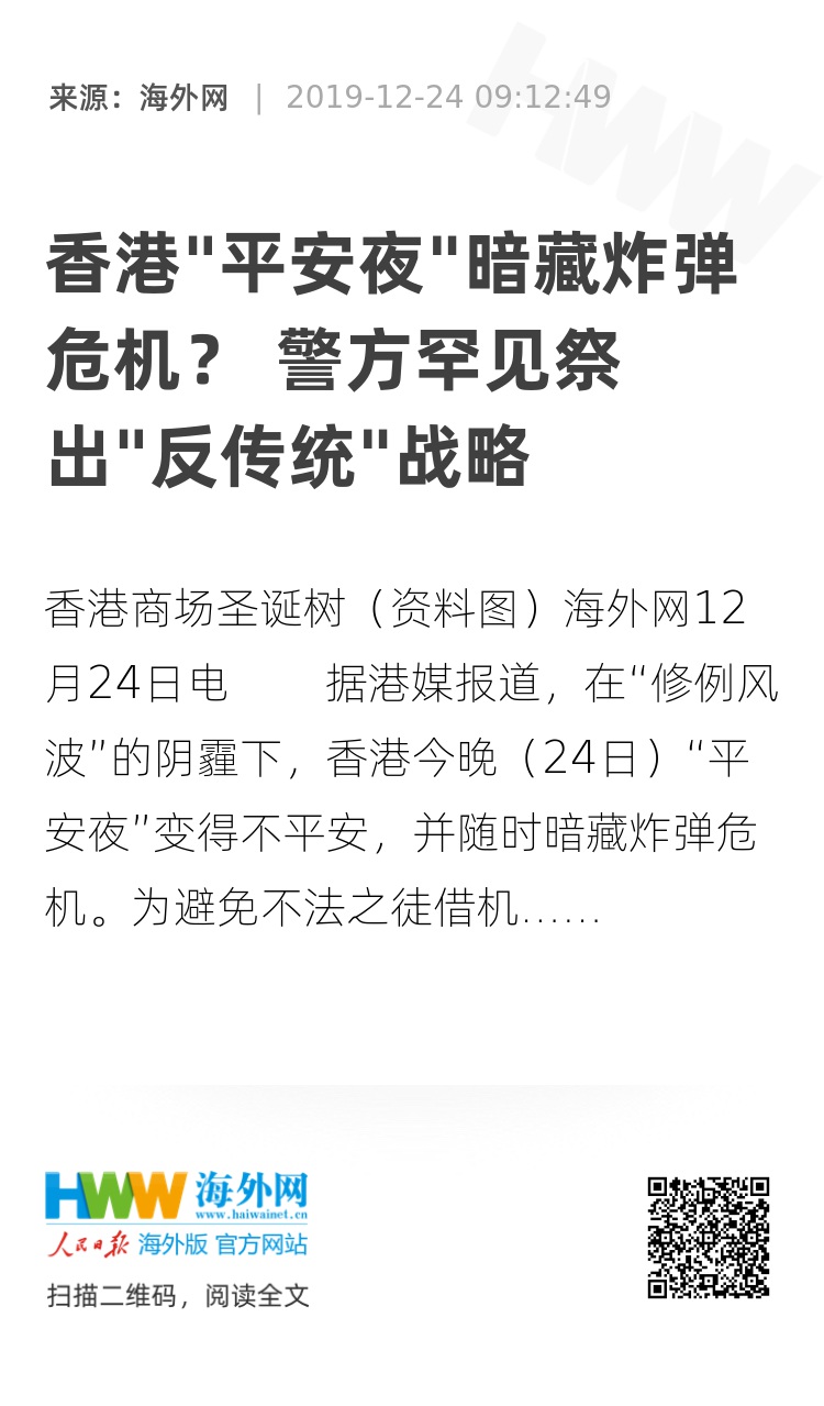 海外网12月24日电 据港媒报道,在“修例风波”的阴霾下,香港今晚(24日)“平安夜”变得不平安,并随时暗藏炸弹危机。为避免不法之徒借机袭击人群,警方罕有地作出“反传统”安排,采取分散策略,并且弹性封路。