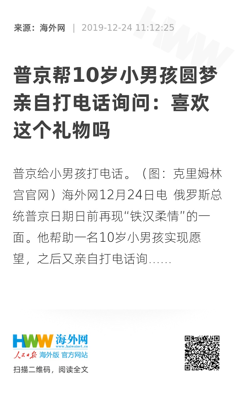 海外网12月24日电 俄罗斯总统普京日期日前再现“铁汉柔情”的一面。他帮助一名10岁小男孩实现愿望,之后又亲自打电话询问小男孩,是否喜欢这个礼物。