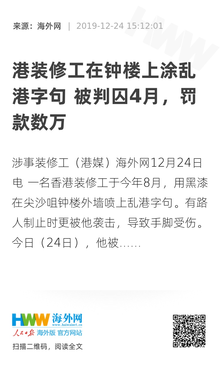 海外网12月24日电 一名香港装修工于今年8月,用黑漆在尖沙咀钟楼外墙喷上乱港字句。有路人制止时更被他袭击,导致手脚受伤。今日(24日),他被九龙城法院判囚4个月。
