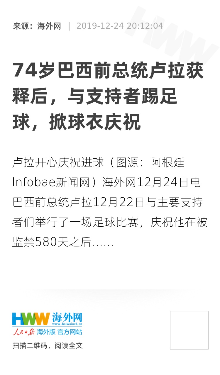 海外网12月24日电 巴西前总统卢拉12月22日与主要支持者们举行了一场足球比赛,庆祝他在被监禁580天之后于11月重获自由。