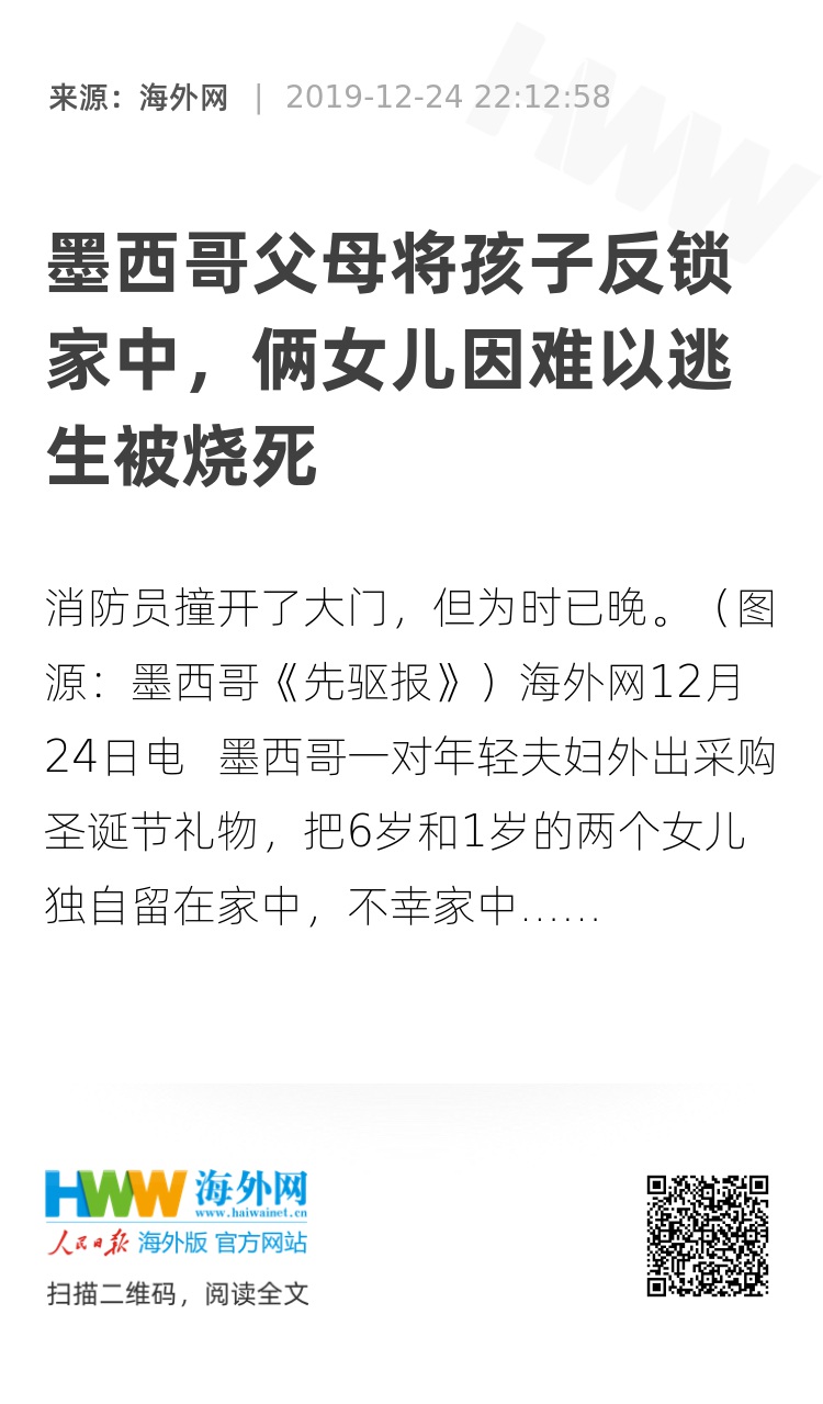 海外网12月24日电 墨西哥一对年轻夫妇外出采购圣诞节礼物,把6岁和1岁的两个女儿独自留在家中,不幸家中着火,两名儿童被烧死。