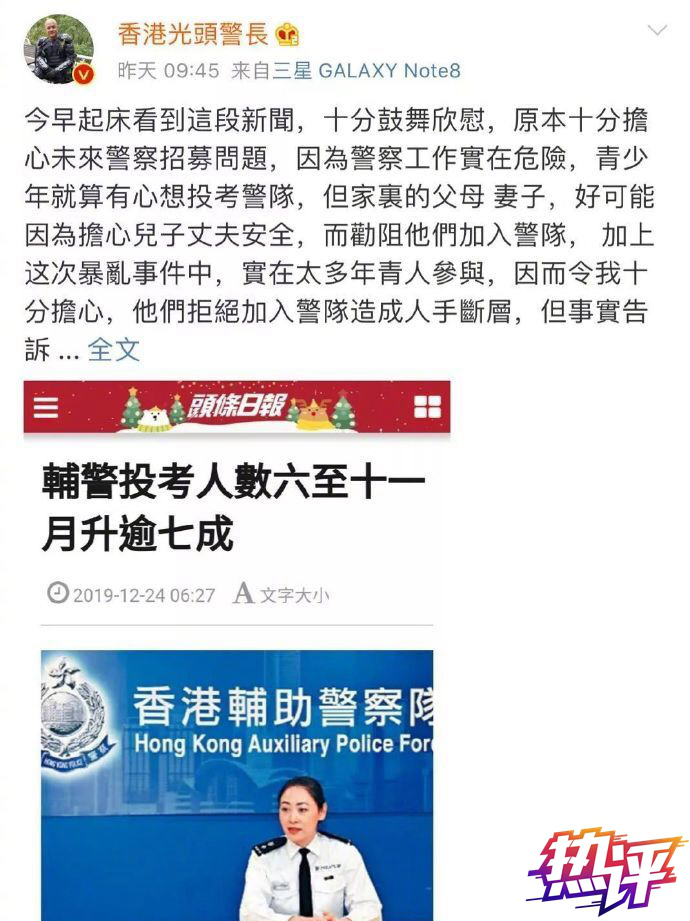 “香港光头警长刘Sir也在微博转发了这次投考辅警数据爆表的消息,并表示“十分鼓舞欣慰”。也有网友在社交媒体发表评论称,投考辅警人数增加超七成,除了表达市民“撑警决心”,也直接反映香港正义市民和暴力作斗争,保护家园的决心。有网友表示:“热血青年越多,香港越有希望。”有网友写到:“这个真是太好了,爱国爱港的人还是多数,香港有希望了,坚持就是胜利。”另有网友回复:“看到充满正义和意愿肩负社会责任的人加入警队,真是好欣慰感动。”