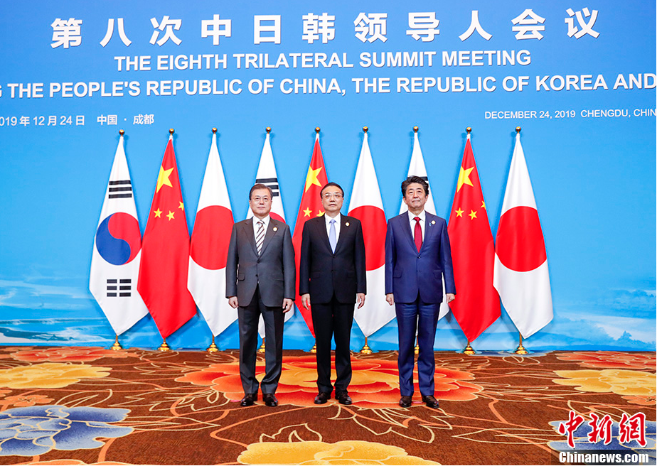 12月24日,中国国务院总理李克强在成都与韩国总统文在寅、日本首相安倍晋三共同出席第八次中日韩领导人会议。图为会议前,中日韩领导人合影。中新社记者 刘震 摄
