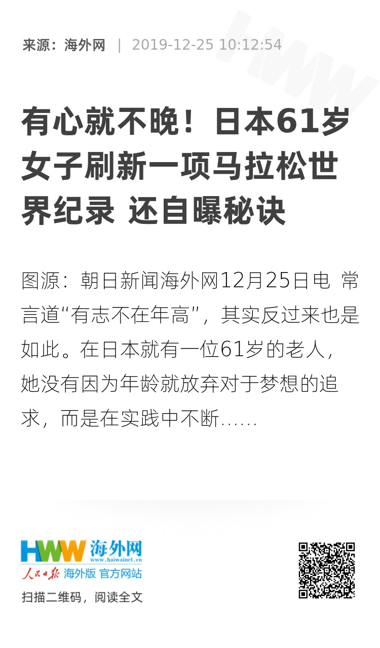 海外网12月25日电 常言道“有志不在年高”,其实反过来也是如此。在日本就有一位61岁的老人,她没有因为年龄就放弃对于梦想的追求,而是在实践中不断超越与突破自己。