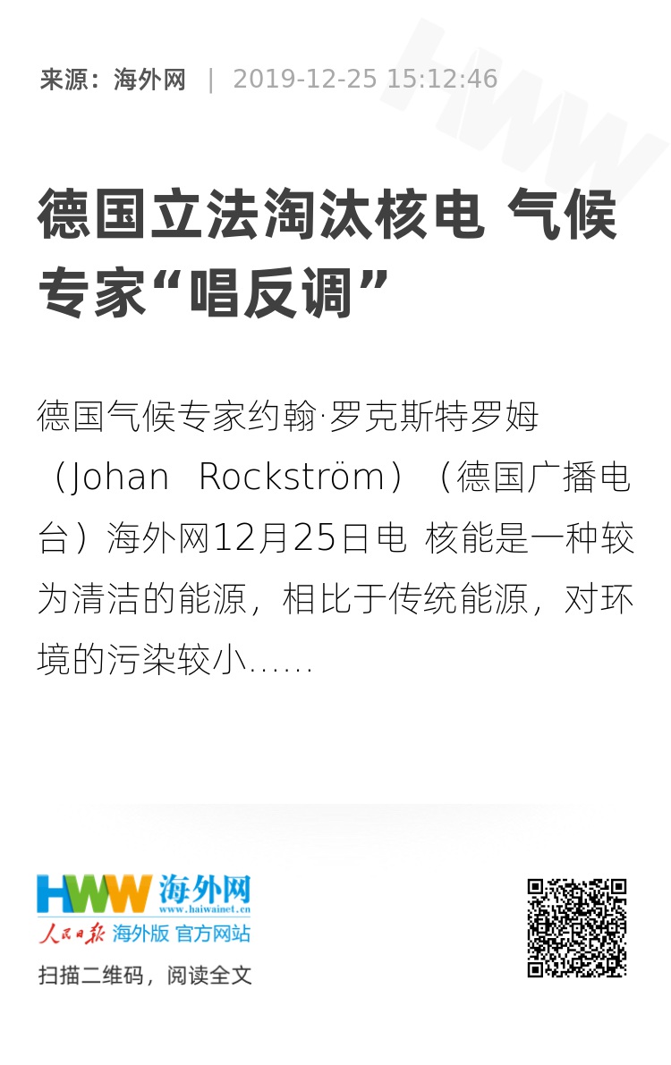据德国广播电台24日报道,近日,德国气候专家约翰·罗克斯特罗姆(Johan Rockström)在接受记者采访时表达了对于德国政府淘汰核电的观点。他对政府的做法持批评态度,认为虽然“核电不是未来”,但鉴于当前面临的气候危机,核能显然不应该被化石燃料取代。