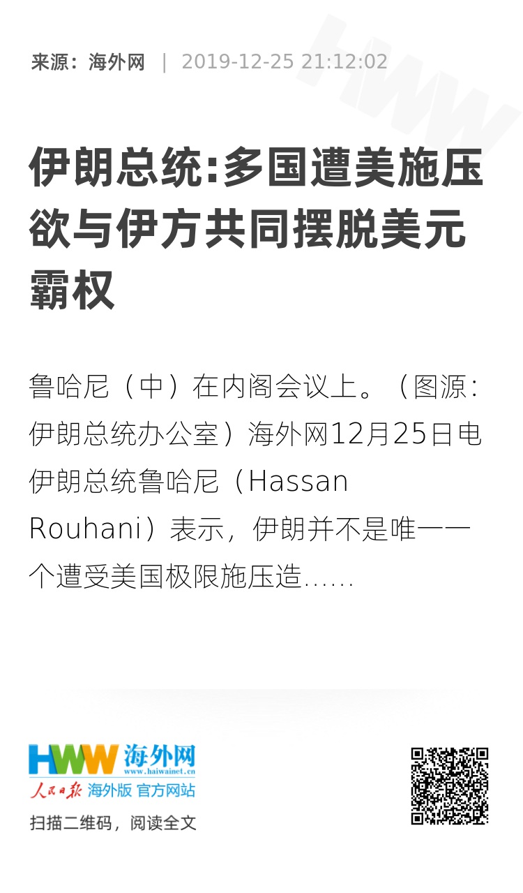 海外网12月25日电 伊朗总统鲁哈尼(Hassan Rouhani)表示,伊朗并不是唯一一个遭受美国极限施压造成经济灾难的国家,伊朗在与其他国家的互动中已挫败美方的压力行动。