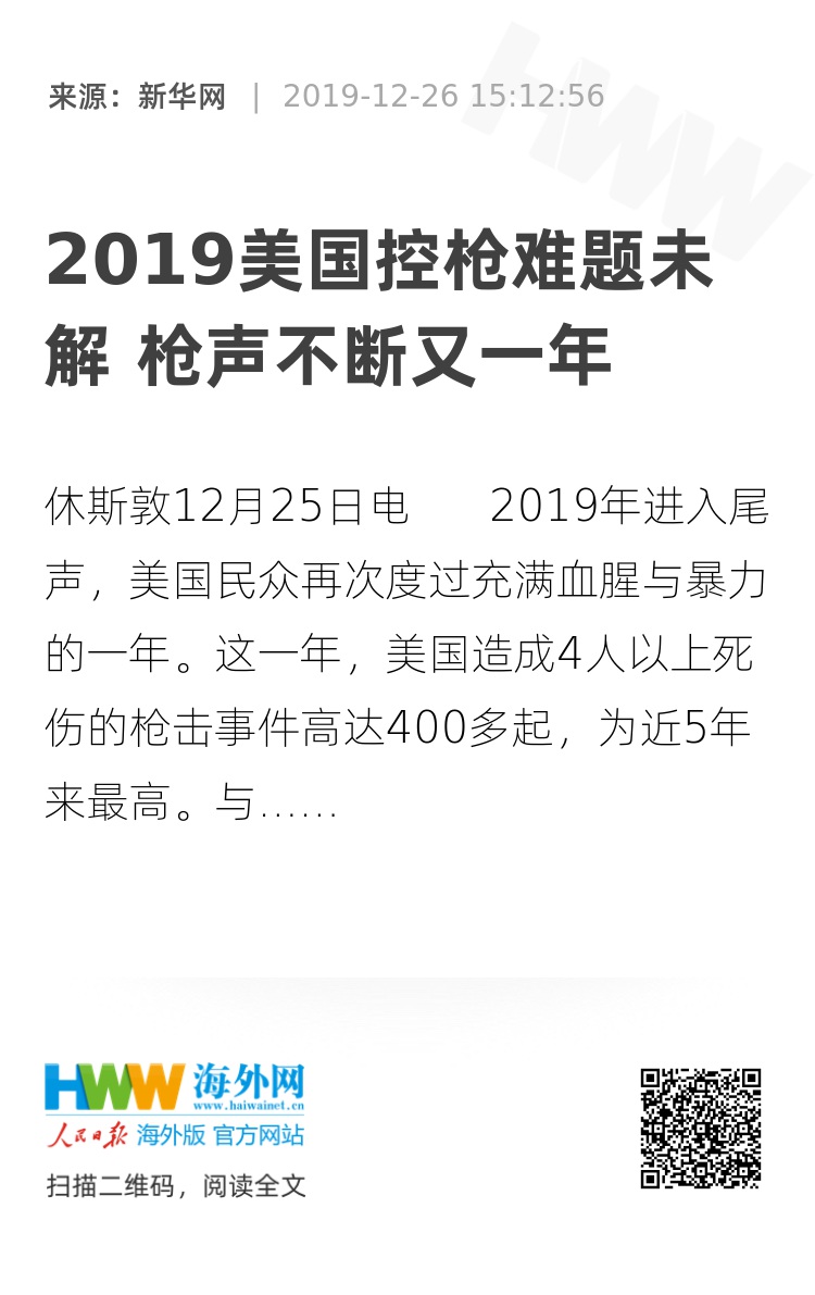新华社休斯敦12月25日电 2019年进入尾声,美国民众再次度过充满血腥与暴力的一年。这一年,美国造成4人以上死伤的枪击事件高达400多起,为近5年来最高。与此同时,种族矛盾成为多起恶性枪击事件的诱因。
