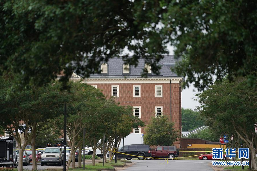 这是6月1日拍摄的发生枪击事件的美国弗吉尼亚比奇市市政中心的一处建筑。美国东部弗吉尼亚州弗吉尼亚比奇市5月31日下午发生一起严重枪击事件,造成至少12人死亡。新华社记者 刘杰 摄