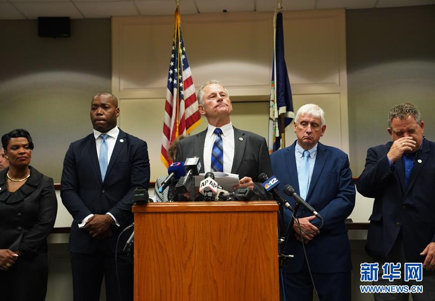 6月1日,在美国弗吉尼亚比奇市,市政官员戴夫·汉森(中)出席新闻发布会。美国东部弗吉尼亚州弗吉尼亚比奇市5月31日下午发生一起严重枪击事件,造成至少12人死亡。新华社记者 刘杰 摄