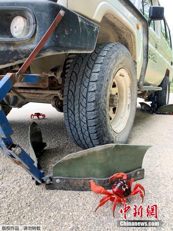 澳大利亚圣诞岛遭红蟹迁徙堵路 市民发明“扫蟹车”上路