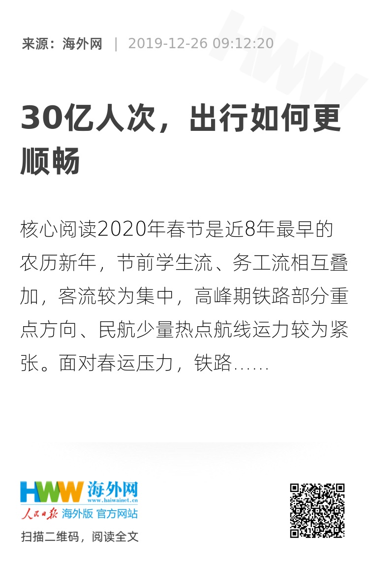 2020年春节是近8年最早的农历新年,节前学生流、务工流相互叠加,客流较为集中,高峰期铁路部分重点方向、民航少量热点航线运力较为紧张。面对春运压力,铁路、公路、民航将继续增强运力,推动换乘更加方便,出行更加智能,票价优惠扩围,保证旅客不仅“走得了”,还要“走得好”“走得快”。