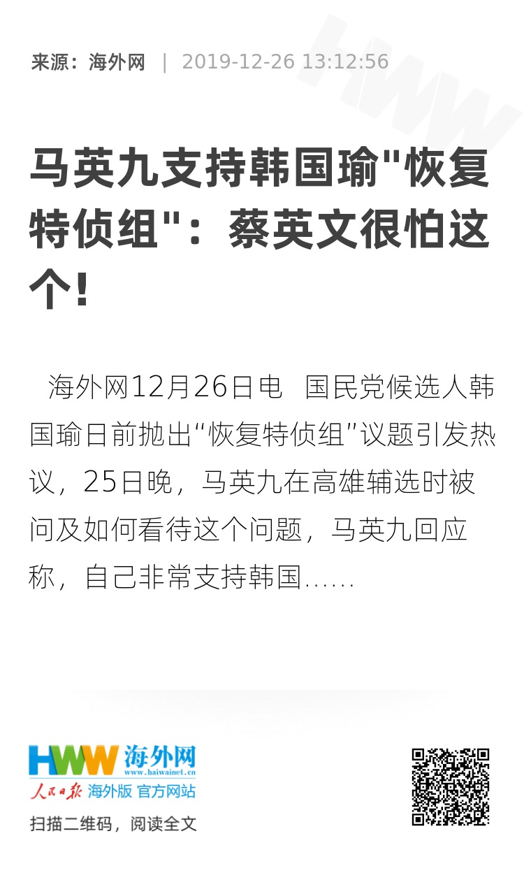 海外网12月26日电 国民党候选人韩国瑜日前抛出“恢复特侦组”议题引发热议,25日晚,马英九在高雄辅选时被问及如何看待这个问题,马英九回应称,自己非常支持韩国瑜“恢复特侦组”,并称对于蔡英文的“反对”态度毫不意外,“蔡英文他们很怕特侦组,有了特侦组,民进党做某些事的时候,会觉得很不方便。”