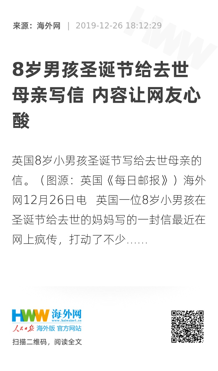 海外网12月26日电 英国一位8岁小男孩在圣诞节给去世的妈妈写的一封信最近在网上疯传,打动了不少人的心。