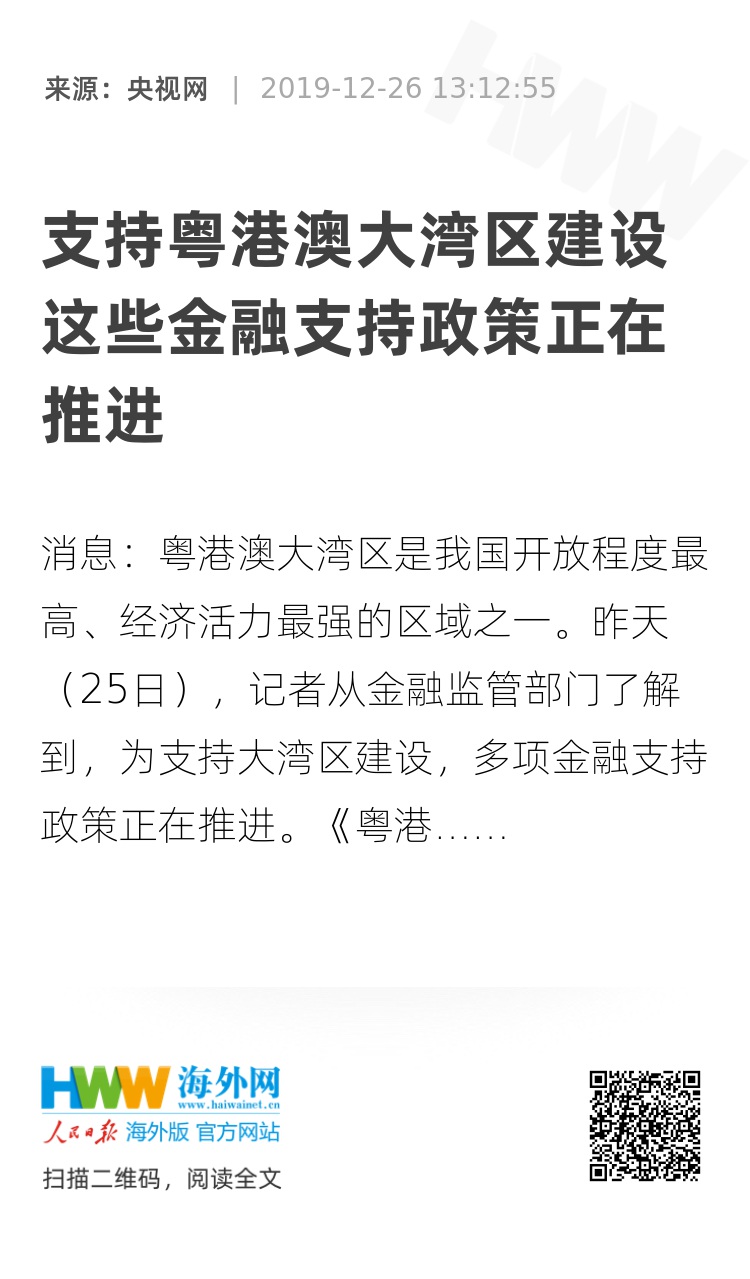 央视网消息:粤港澳大湾区是我国开放程度最高、经济活力最强的区域之一。昨天(25日),记者从金融监管部门了解到,为支持大湾区建设,多项金融支持政策正在推进。