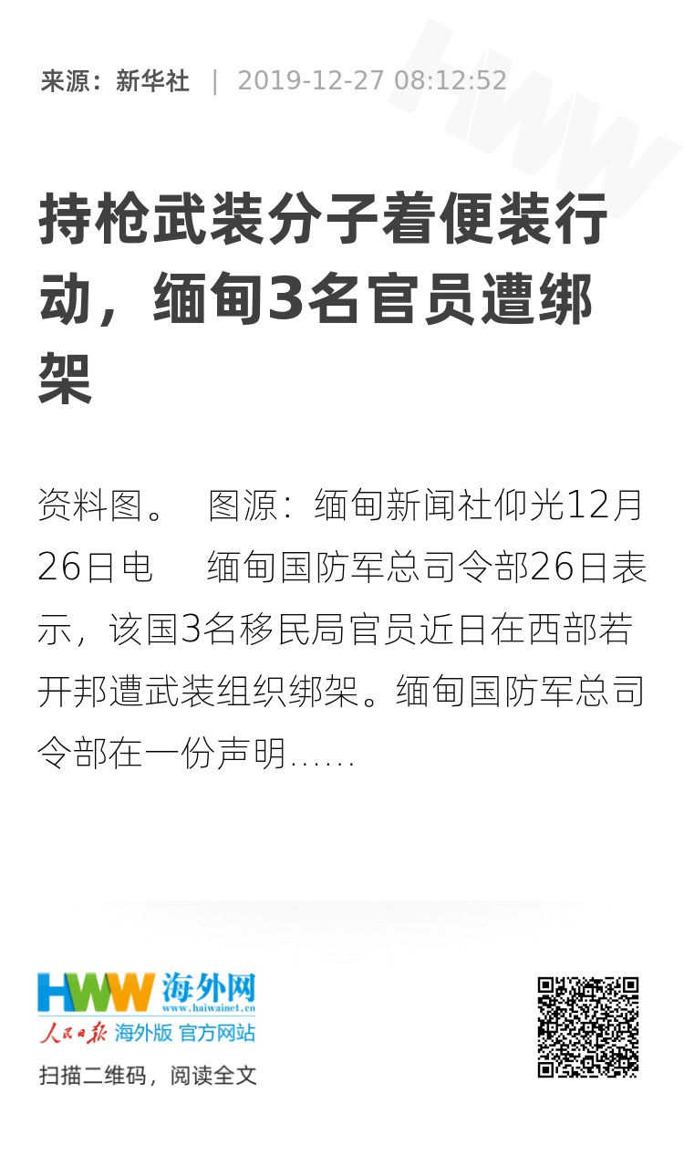 原标题:《缅甸3名移民局官员遭武装组织绑架》