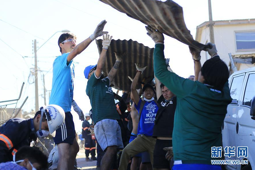 12月25日,在智利瓦尔帕莱索,志愿者在火灾后的现场进行清理工作。新华社/智利一号通讯社