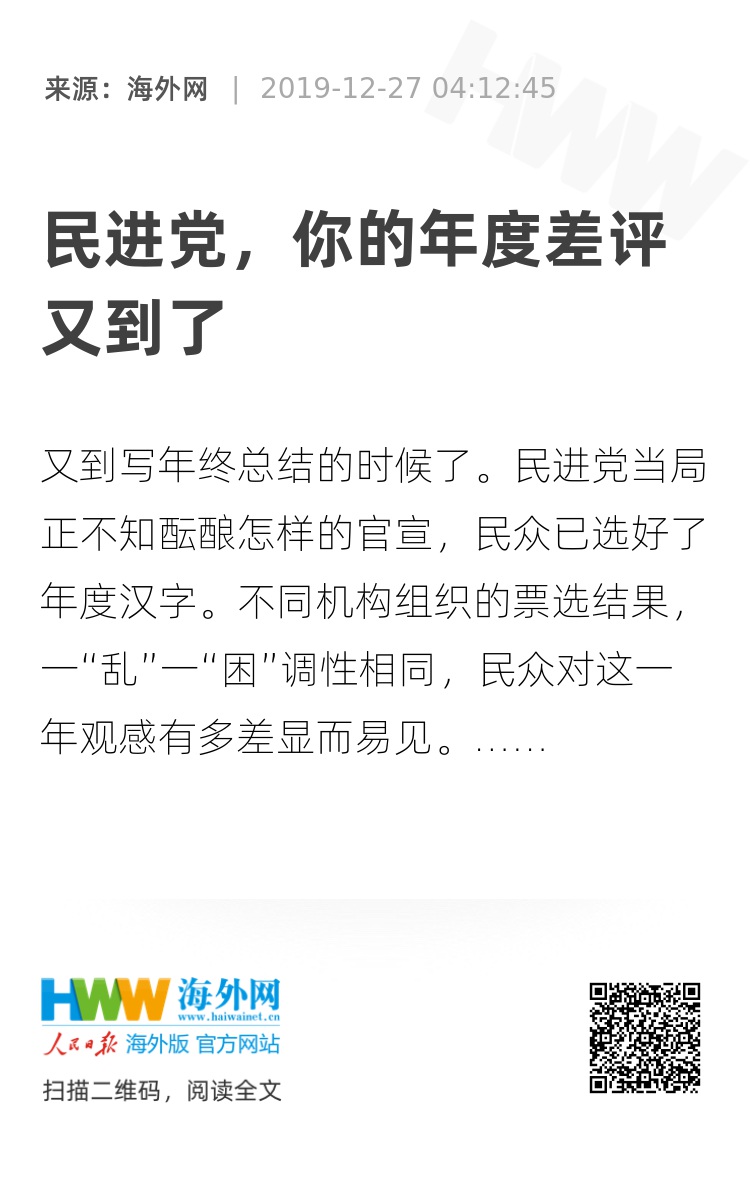 台湾民众以年度汉字给民进党当局送差评,已经不是第一次了。自打民进党上台以来,民众的吐槽声就没停过。2016年是新执政者胡作非为下的“苦”,2017年是前途黯淡的“茫”,2018年乐见民进党“九合一”选举大败而“翻”,今年又见当局作恶不断致使岛内大“乱”。这日子真是没法过了。