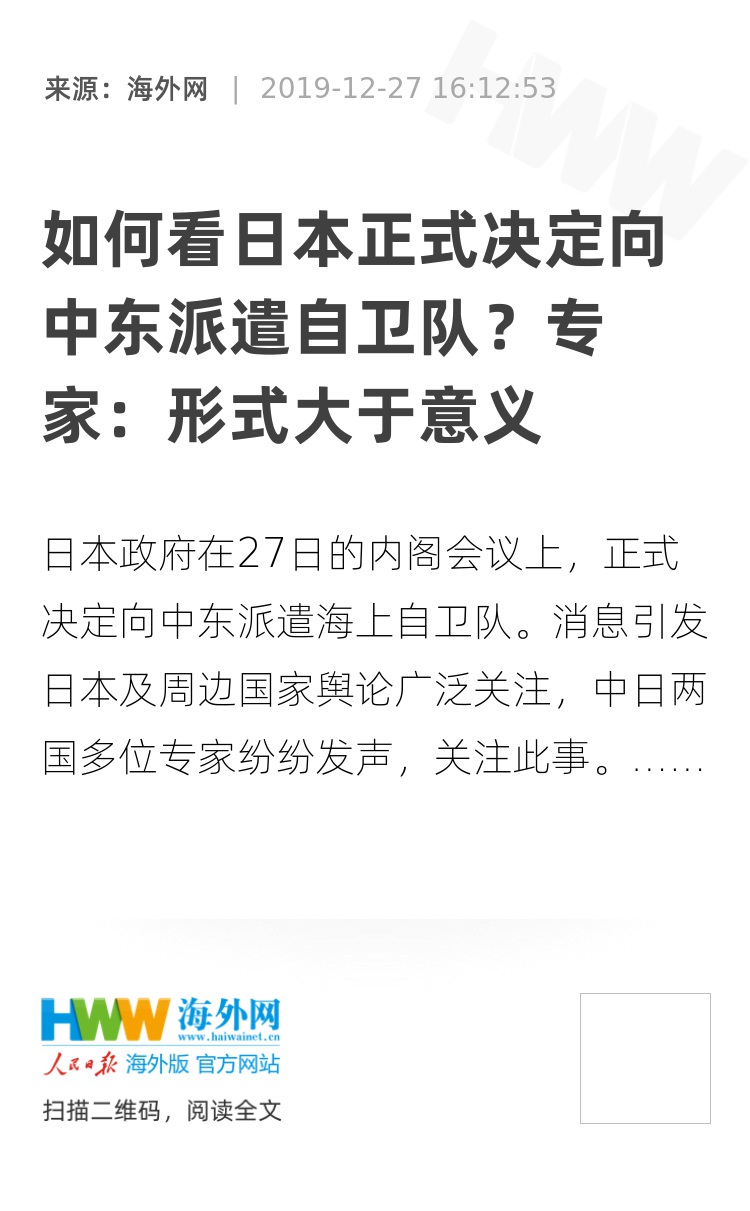 海外网12月27日电 日本政府在27日的内阁会议上,正式决定向中东派遣海上自卫队。日本政府称,此举以“调查研究”为目的,是为了确保中东地区的日本船只安全,以及收集必要的信息。该消息引发日本及周边国家舆论广泛关注,中日两国多位专家纷纷发声,关注此事。