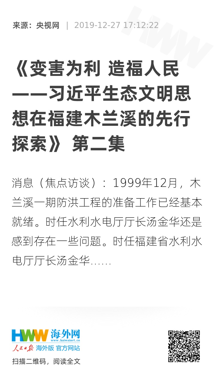 央视网消息(焦点访谈):1999年12月,木兰溪一期防洪工程的准备工作已经基本就绪。时任水利水电厅厅长汤金华还是感到存在一些问题。