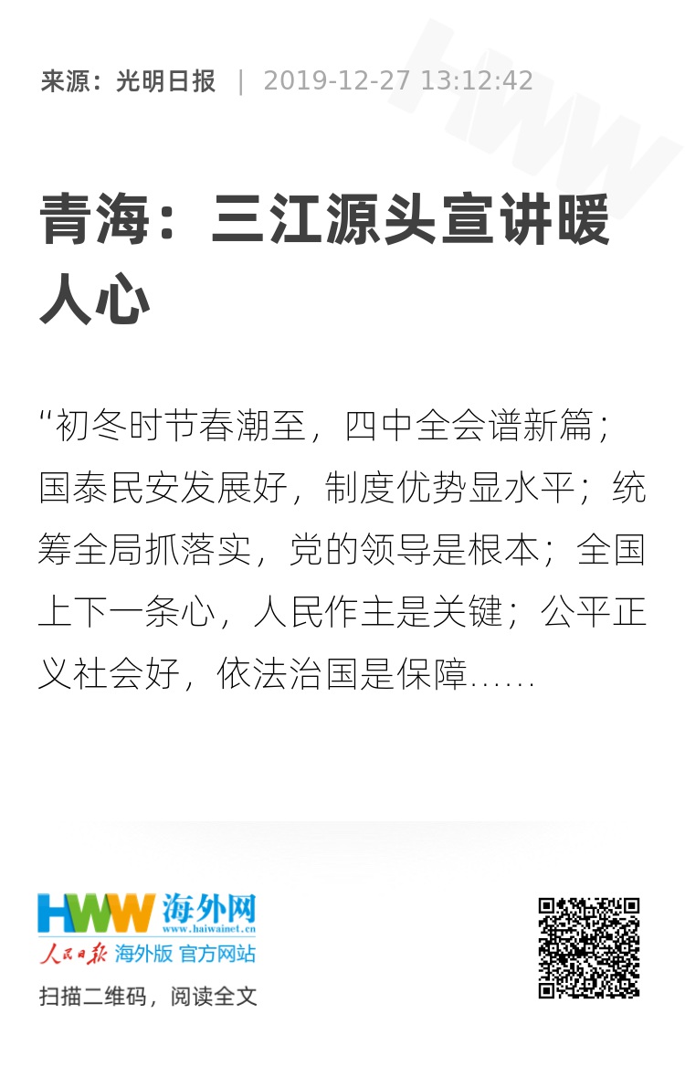 从三江源头的牧场草原到河湟谷地的农家小院,从座无虚席的礼堂到人头攒动的城镇广场,一场场深入透彻的宣讲,一次次鲜活生动的解读,让习近平新时代中国特色社会主义思想如春风化雨滋润青海大地,让党的十九届四中全会精神走进基层、深入人心。