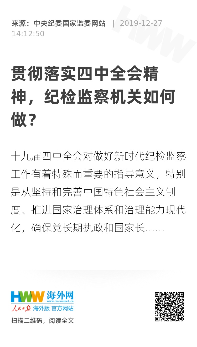 纪检监察机关要认真学习、深刻领会四中全会重大意义和精神实质,切实把思想和行动统一到党中央决策部署上来,增强“四个意识”、坚定“四个自信”、做到“两个维护”,立足职能职责,在坚持和完善中国特色社会主义制度、推进国家治理体系和治理能力现代化中,着力发挥监督保障执行、促进完善发展作用,推动新时代纪检监察工作高质量发展,为全面建成小康社会提供坚强保证。