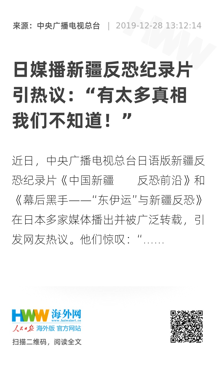 近日,中央广播电视总台日语版新疆反恐纪录片《中国新疆 反恐前沿》和《幕后黑手——“东伊运”与新疆反恐》在日本多家媒体播出并被广泛转载,引发网友热议。他们惊叹:“有太多真相我们不知道!”
