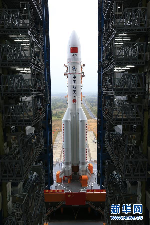 长征五号遥三运载火箭在中国文昌航天发射场完成技术区相关工作后,垂直转运至发射区(12月21日摄)。新华社发(屠海超 摄)