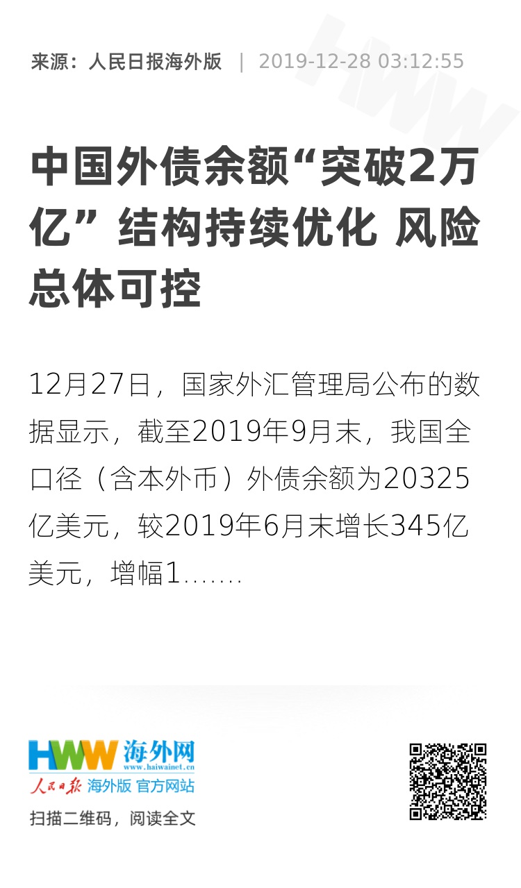 12月27日,国家外汇管理局公布的数据显示,截至2019年9月末,我国全口径(含本外币)外债余额为20325亿美元,较2019年6月末增长345亿美元,增幅1.7%。相关人士指出,随着我国经济发展以及持续扩大开放,外债总规模增长是一个正常现象,应理性看待外债余额突破2万亿美元。整体来看,当前外债存量结构合理,结构持续优化,外债主要指标均在国际公认的安全线内,我国外债风险总体可控。