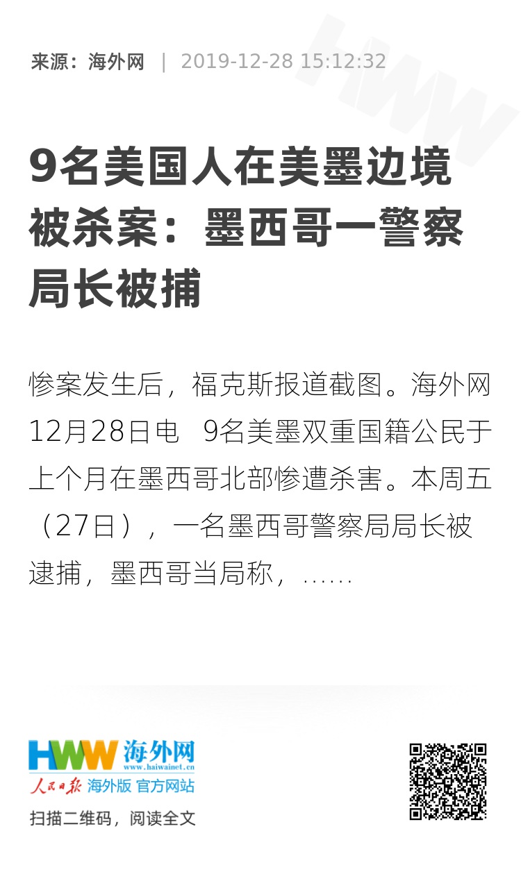 海外网12月28日电 9名美墨双重国籍公民于上个月在墨西哥北部惨遭杀害。本周五(27日),一名墨西哥警察局局长被逮捕,墨西哥当局称,这名局长与该案件有关。