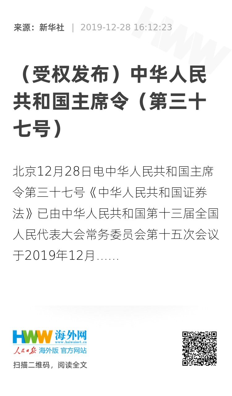 《中华人民共和国证券法》已由中华人民共和国第十三届全国人民代表大会常务委员会第十五次会议于2019年12月28日修订通过,现予公布,自2020年3月1日起施行。