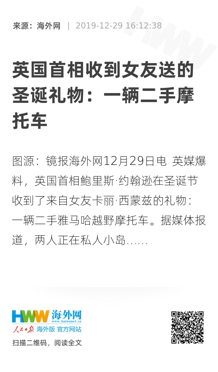 海外网12月29日电 英媒爆料,英国首相鲍里斯·约翰逊在圣诞节收到了来自女友卡丽·西蒙兹的礼物:一辆二手雅马哈越野摩托车。据媒体报道,两人正在私人小岛享受圣诞假期。