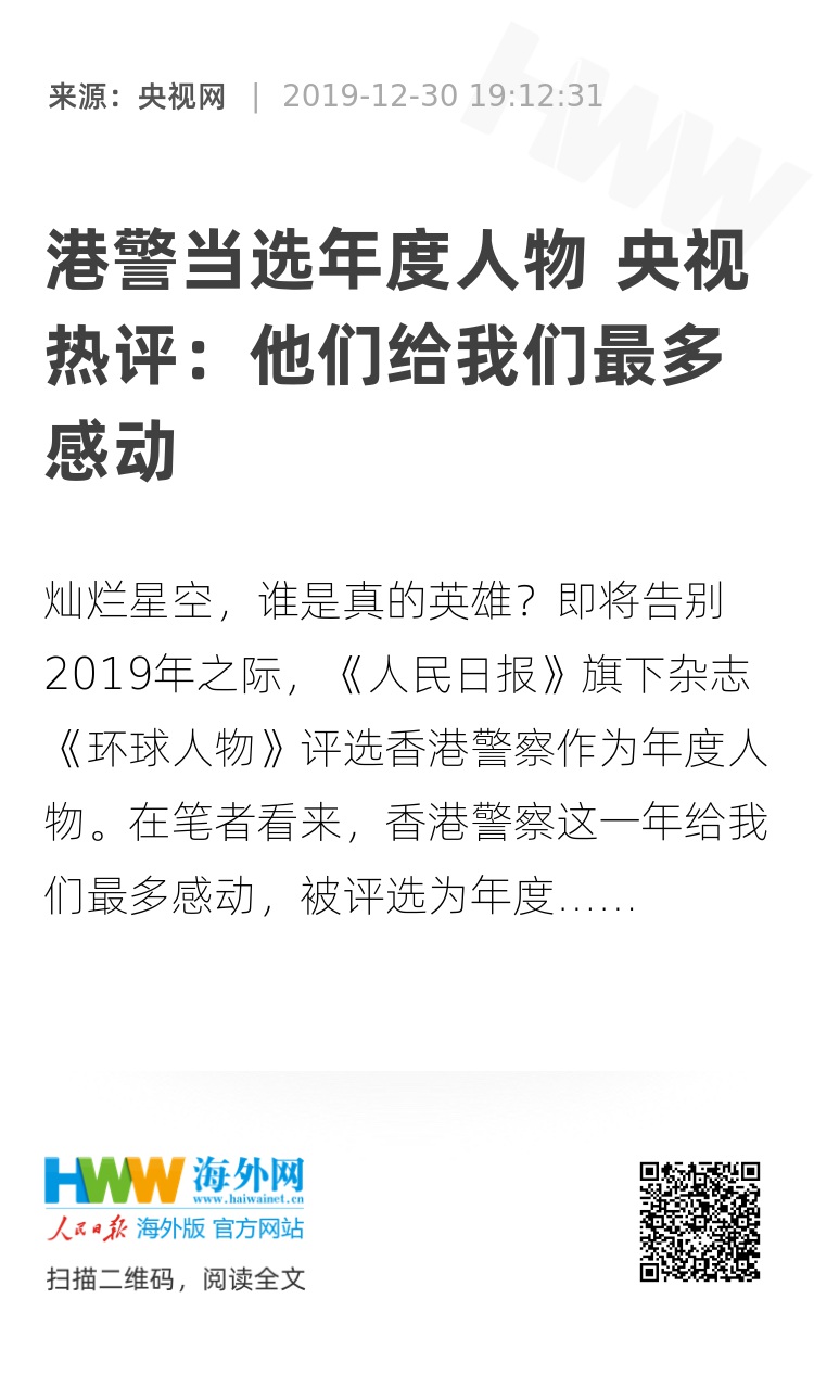 灿烂星空,谁是真的英雄?即将告别2019年之际,《人民日报》旗下杂志《环球人物》评选香港警察作为年度人物。在笔者看来,香港警察这一年给我们最多感动,被评选为年度人物当之无愧。惟愿新一年,“再没有恨,也没有了痛”,“人间处处都有爱的影踪”。