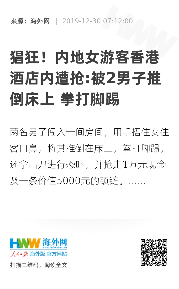 海外网12月30日电 昨日(29日)下午,香港一酒店房间内,一名内地女旅客遭两持刀男子殴打、抢劫。