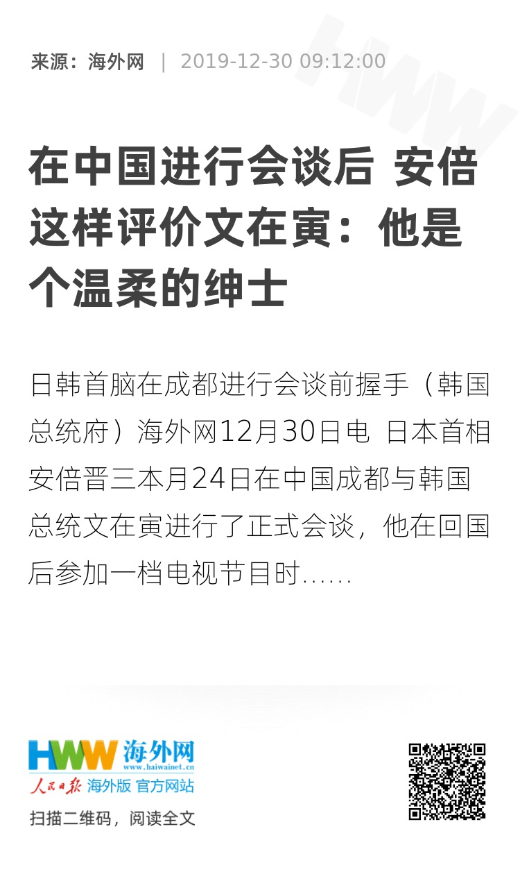 海外网12月30日电 日本首相安倍晋三本月24日在中国成都与韩国总统文在寅进行了正式会谈,他在回国后参加一档电视节目时,评价韩国总统文在寅是个温柔的绅士,希望以后能频繁见面。