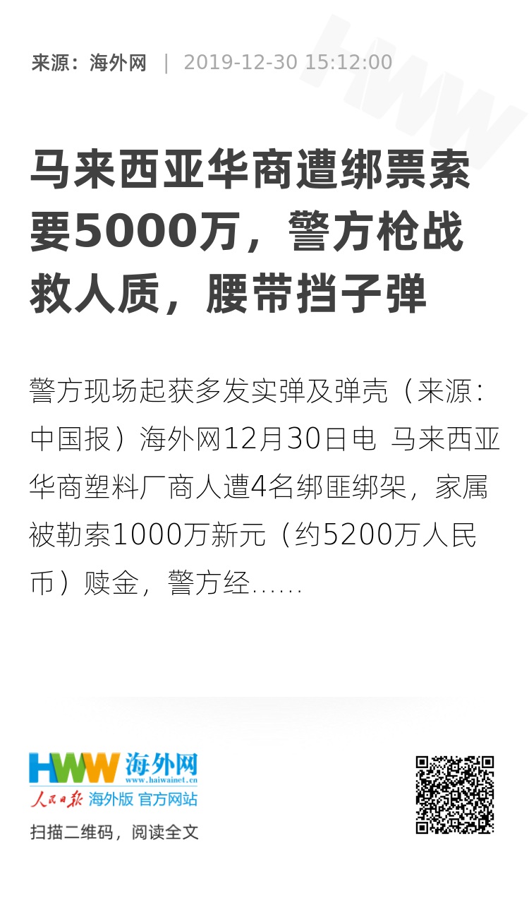 海外网12月30日电 马来西亚华商塑料厂商人遭4名绑匪绑架,家属被勒索1000万新元(约5200万人民币)赎金,警方经过近6小时行动,在两轮惊心动魄的枪战后,击毙2名绑匪,救出人质。