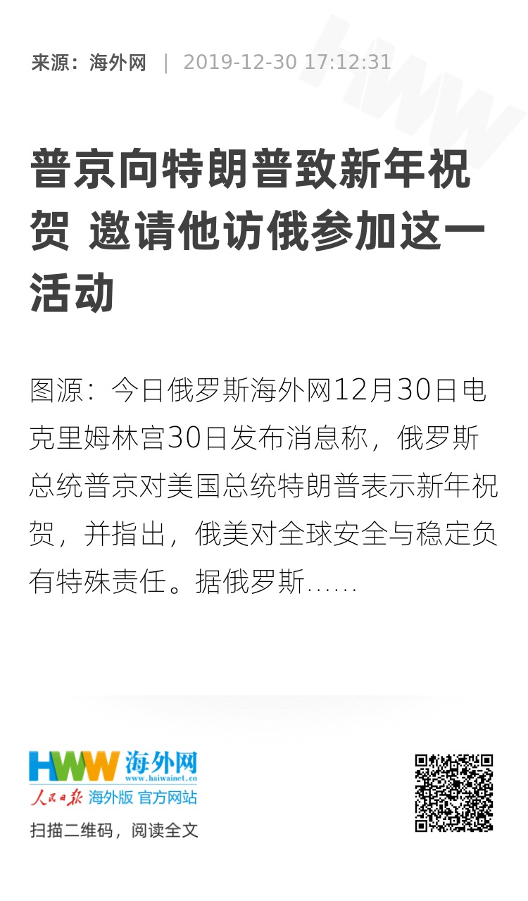据俄罗斯卫星网30日报道,除了新年祝贺外,克里姆林宫还发布消息称,普京确认邀请特朗普访问莫斯科,参加卫国战争胜利75周年庆祝活动。