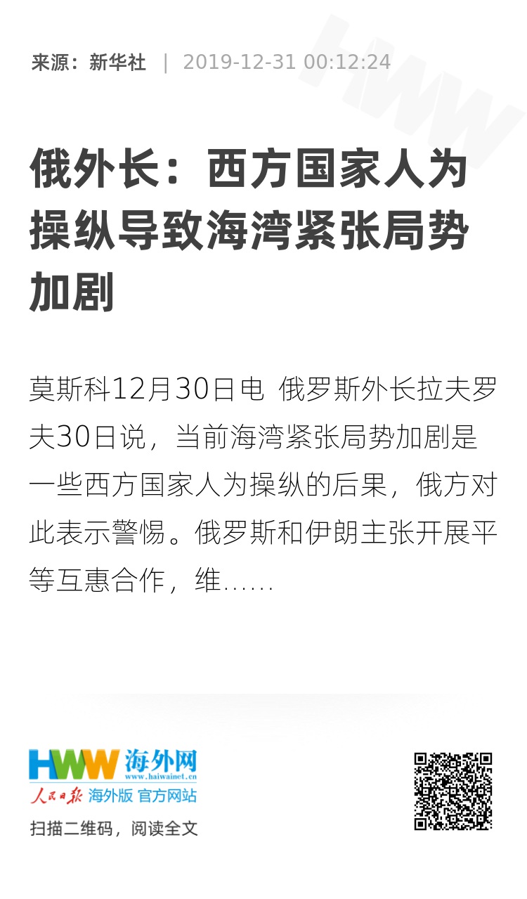 新华社莫斯科12月30日电 俄罗斯外长拉夫罗夫30日说,当前海湾紧张局势加剧是一些西方国家人为操纵的后果,俄方对此表示警惕。俄罗斯和伊朗主张开展平等互惠合作,维护海湾地区安全。