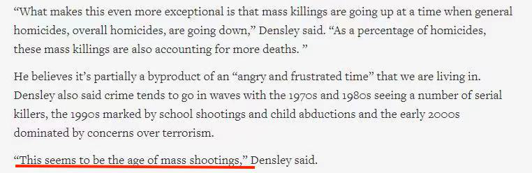 据美联社报道,大都会州立大学犯罪学家、教授詹姆斯·丹斯利表示,美国大规模杀戮事件的数量在增加。他认为,这一现象可能是因为美国社会当前正在经历着愤怒和挫折。“看起来,大规模枪杀的时代(age of mass shootings)来临了。”
