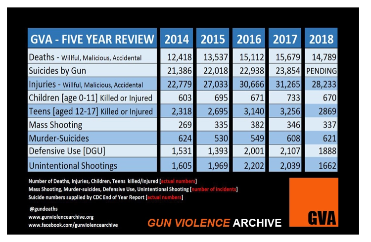 △枪支暴力档案(Gun Violence Archive)记录的2014到2018年美国因枪支暴力事件死亡的人数