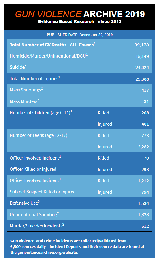 根据“枪支暴力档案”(GVA)的数据,截至12月30日,美国2019年发生了417起大规模枪击事件,共有39173人死于与枪支有关的暴力事件,包括自杀、警察击毙、意外死亡。