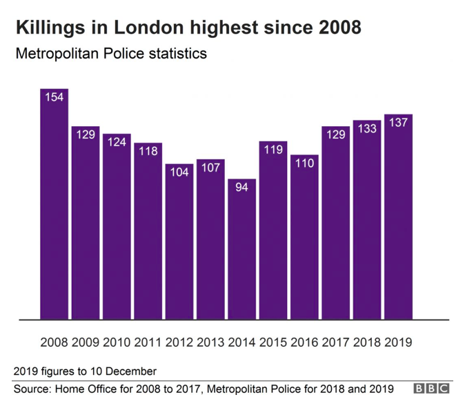 BBC报道称,英国伦敦2019年业已成为凶杀案的重灾区。2019年伦敦的凶杀案数量达到近年来的高峰。截至12月10日,2019年伦敦凶杀案件造成的死亡人数已达137人,且一半以上都是刺杀,仿照防弹背心制作的“防刺背心”今年一度成为英国亚马逊商店的热搜商品。
