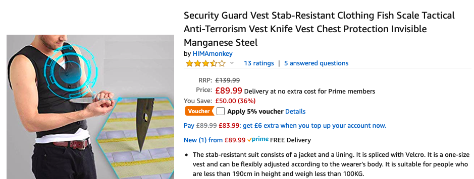 △亚马逊上出售的防刺背心 图片来源:亚马逊