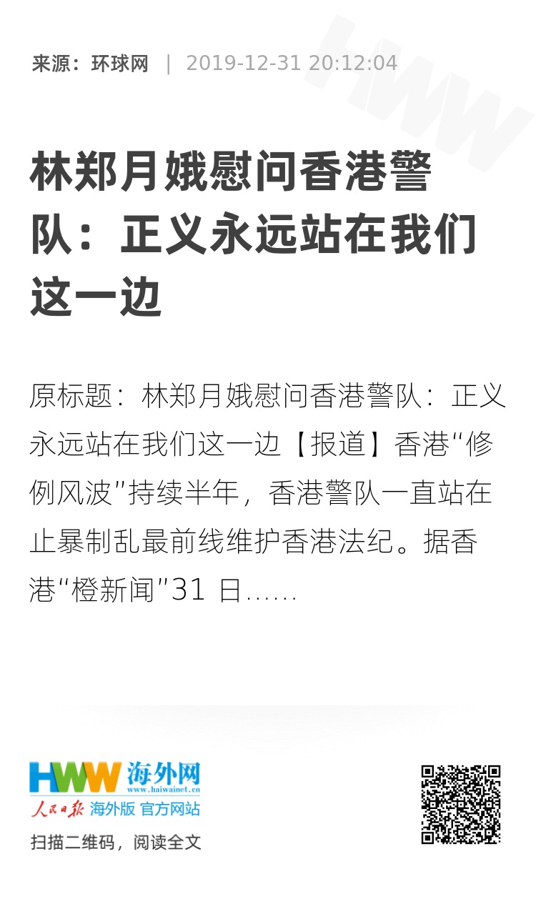 林郑月娥说,往后的日子只有一条路走,就是坚定意志,遏止暴力,将那些违法之徒绳之于法,她相信“正义永远站在我们这一边”。她表示,尽管现在仍然很困难,但她相信全港市民,甚至国际上一些被蒙蔽而批评香港警队的人,迟早会知道,香港这支卓越的警队,是特区政府最大资产之一。她希望踏入2020年,大家一齐努力,尽快将香港恢复到一个“我们可以叫做家的香港”。
