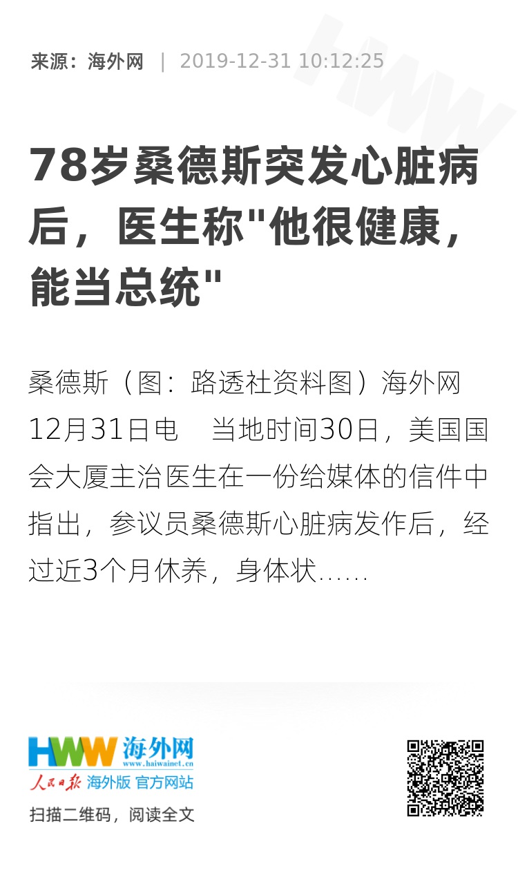 海外网12月31日电 当地时间30日,美国国会大厦主治医生在一份给媒体的信件中指出,参议员桑德斯心脏病发作后,经过近3个月休养,身体状况良好,能继续参加大选。
